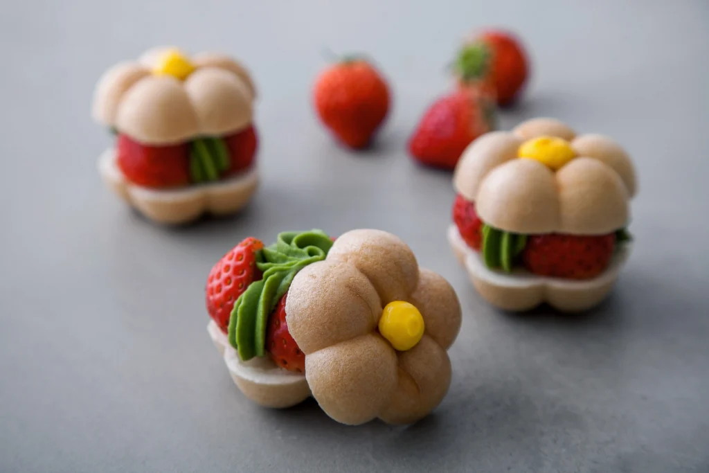 「苺フラワー最中」は可愛すぎると特に話題。お花型の最中のあいだに、苺や抹茶ショコラクリーム、白あんを重ねたこだわりのお菓子で、テイクアウトもできる。