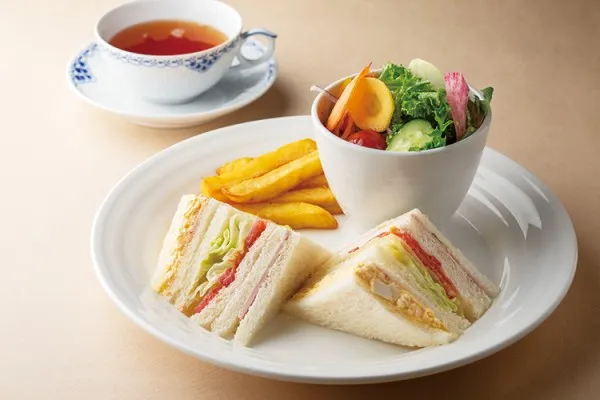 コーヒー・紅茶やケーキ、彩り豊かなサラダとポテトフライが添えられたミックスサンドイッチなど、ひと休みにぴったりなメニューを提供している。