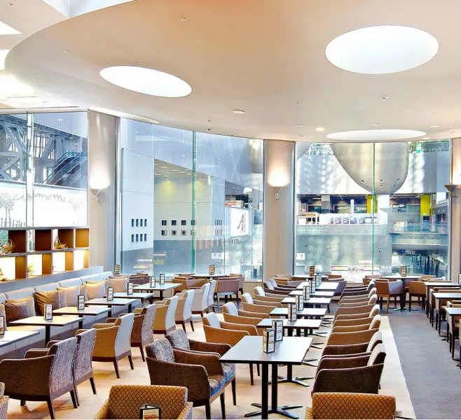 ホテルグランヴィア京都のロビーラウンジ「グランジュール」は、ガラス越しに京都駅を望む、開放的で高級感のある空間。