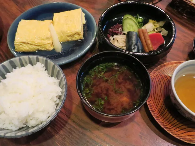 元祖お茶漬けの定番メニュー「すずしろ」をいただきましょう。お出汁の効いた出し巻とお漬物盛り合わせ、赤だしと御飯です。お昼は、御飯のお替り自由です。このシンプルな料理のおいしい事と言ったら!贅を尽くした京料理にも負けない奥深さです。基本的なすずしろの他、季節の一品物が付く「水菜」、お刺身もつく「菜の花」もあります。
