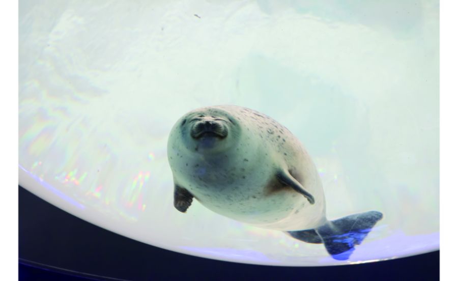 大きな瞳に整った顔立ち。4頭いるアザラシの中でも、べっぴんさんと評判のアラレ。水槽の隅でじっとしていたり、お食事中もポーズを決めたりとフォトジェニックな美貌を振りまいています。