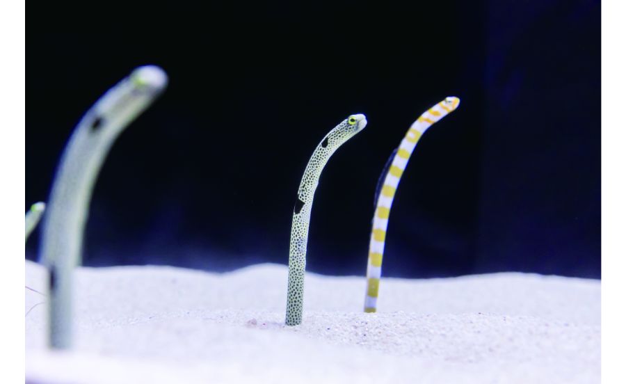 犬のチンに似た丸い顔がユーモラスなチンアナゴ。顔立ちがシャープなシマシマのニシキアナゴ。ほのぼのした見かけによらず縄張り意識が高く、どちらもけんかっ早い性格だとか。