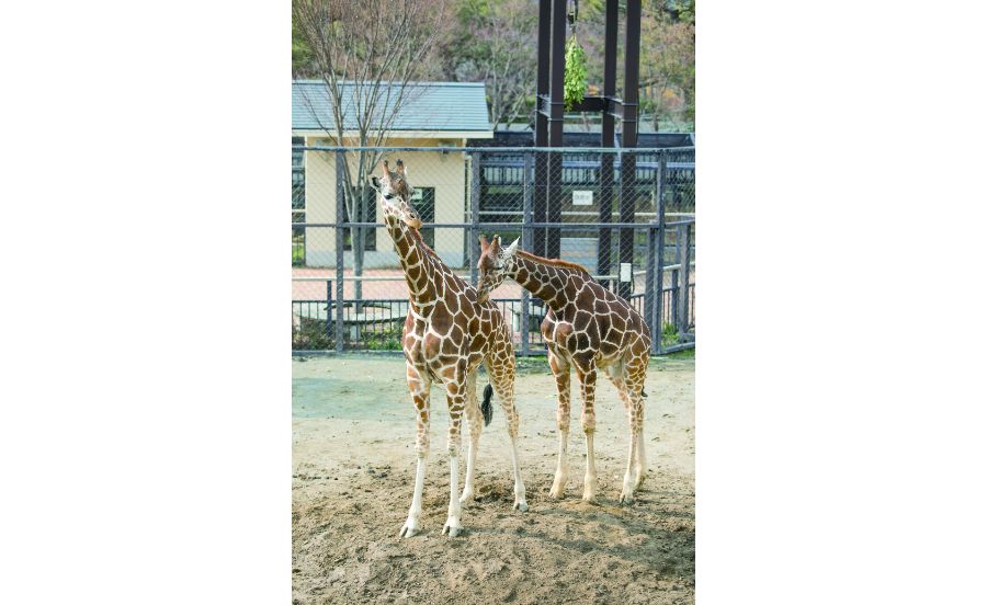 つぶらな瞳が可愛いメイと、おっとりとして落ち着きのある2歳のイブキ。首を絡ませたり、何かとちょっかいをかけたり、2頭がたわむれる姿にほっこり。グラウンドでキリンたちが遊ぶ姿を一望するなら、動物舎の屋上に設けられた木の遊歩道へ!
