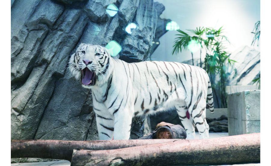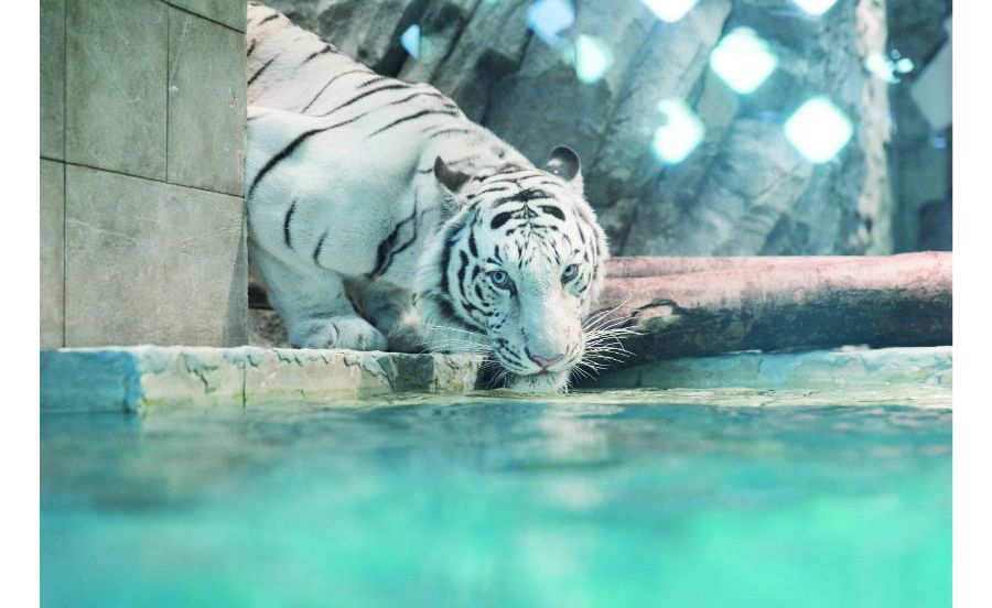水遊びが大好きなことから命名されたホワイトタイガー。普段は穏やかな性格だが、エサの時間にはトラらしい獰猛(どうもう)な姿に。エサを週1日抜いたり、隠して与えるなど自然界に近づけるための工夫もされています。