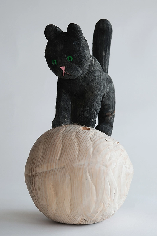 北浦和也の彫刻作品は、主に木材を用いて1つの木塊から作品を彫り出し、リズムを感じる彫り跡と、ポップな色彩を重ねて作り上げられます。