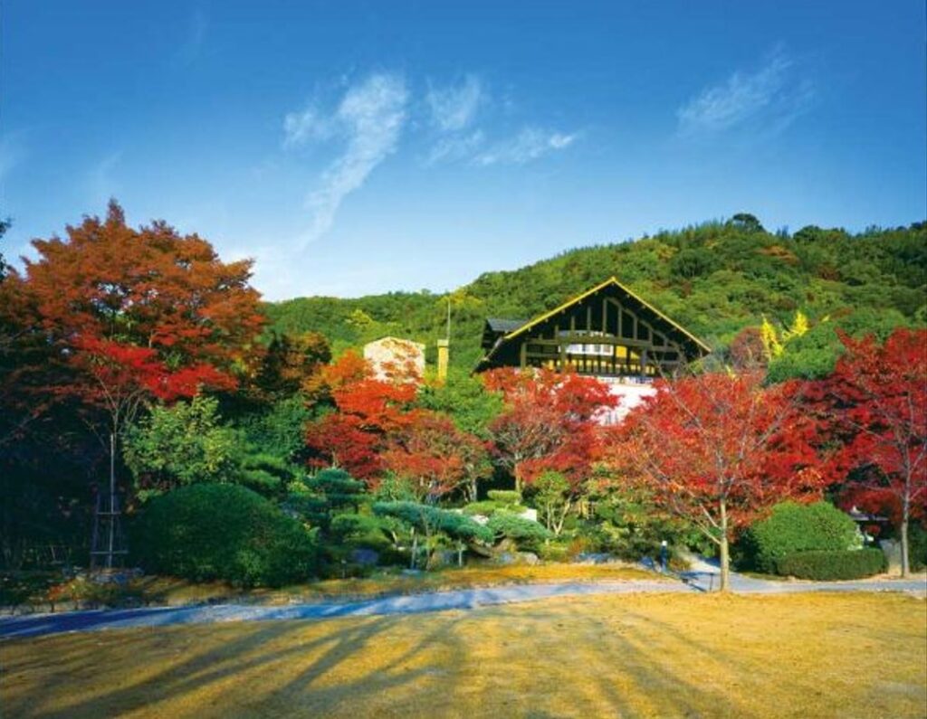 常設展示のクロード・モネの名作「睡蓮」の連作を所蔵する美術館。赤や黄に染まった天王山に、創建当時の姿を復元した美術館がよく映える。広々とした池泉回遊式庭園は、モミジのトンネルや実りの季節を迎えた秋の草花など、見どころが満載。美術館内のカフェで、展示にちなんだスイーツをいただくのもおすすめ。