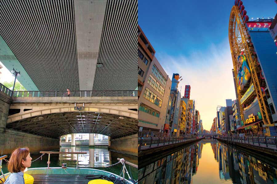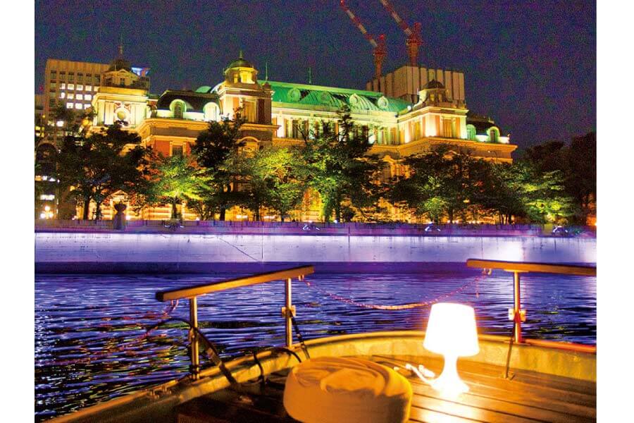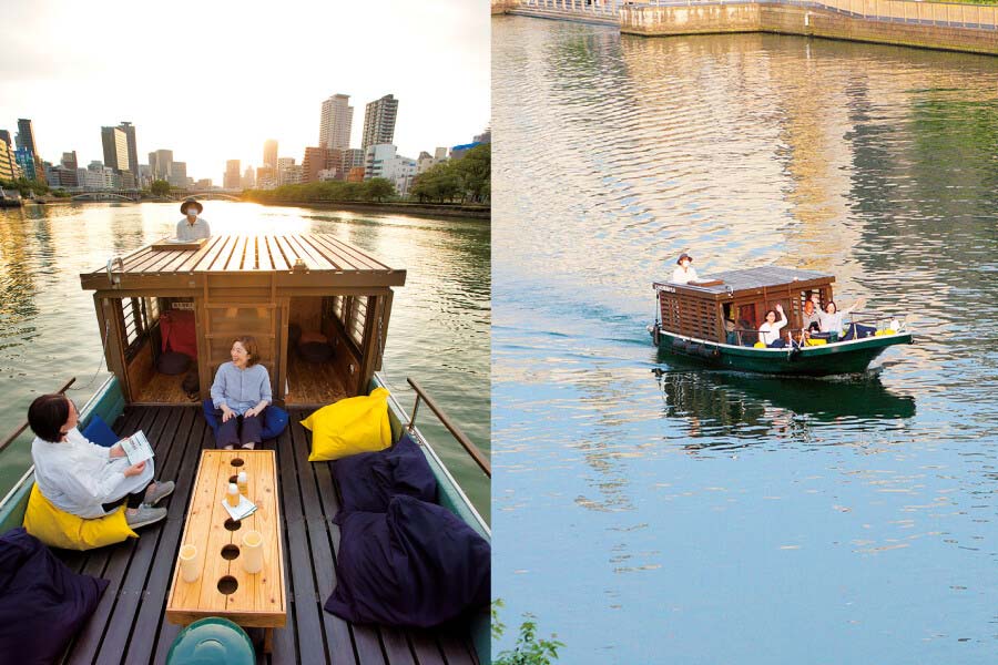 水上のおうちのような小船で、くつろぎながら水の都・大阪を巡ろう。夜の船上から、なじみの街の知らなかった姿をたくさん発見できて楽しい。