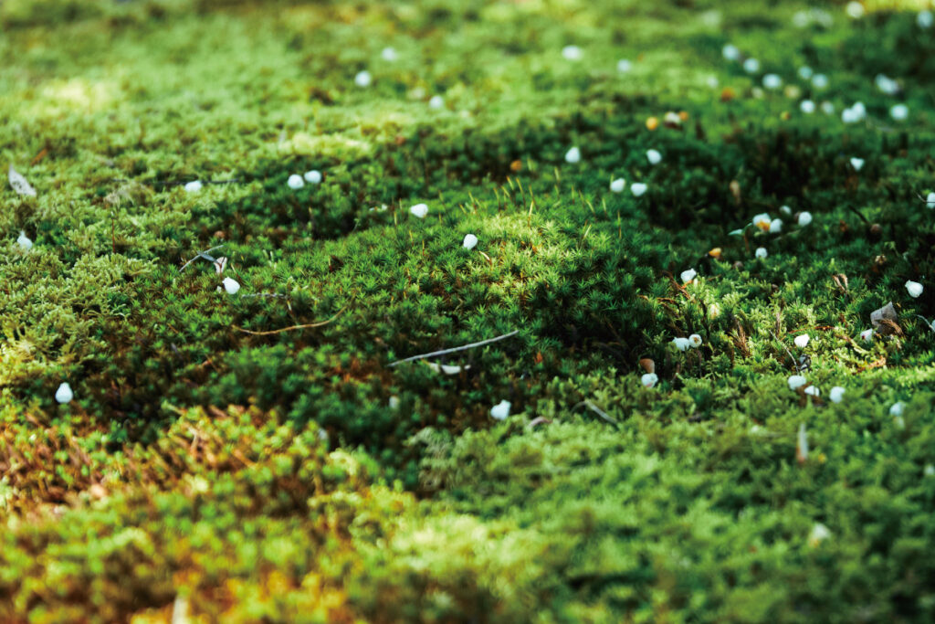 苔は、空気中から水分を吸収するため、湿度の高い日本にぴったりの植物。日本庭園の様式の一つである枯山水の庭では、水を使用せずに山や水を表現するため苔が使用されるという。花など派手なものはつけないが、年中見ることができる苔。その健気さは侘び寂びを〝美〟と感じる日本人の美意識にしっとりと寄り添っているよう。