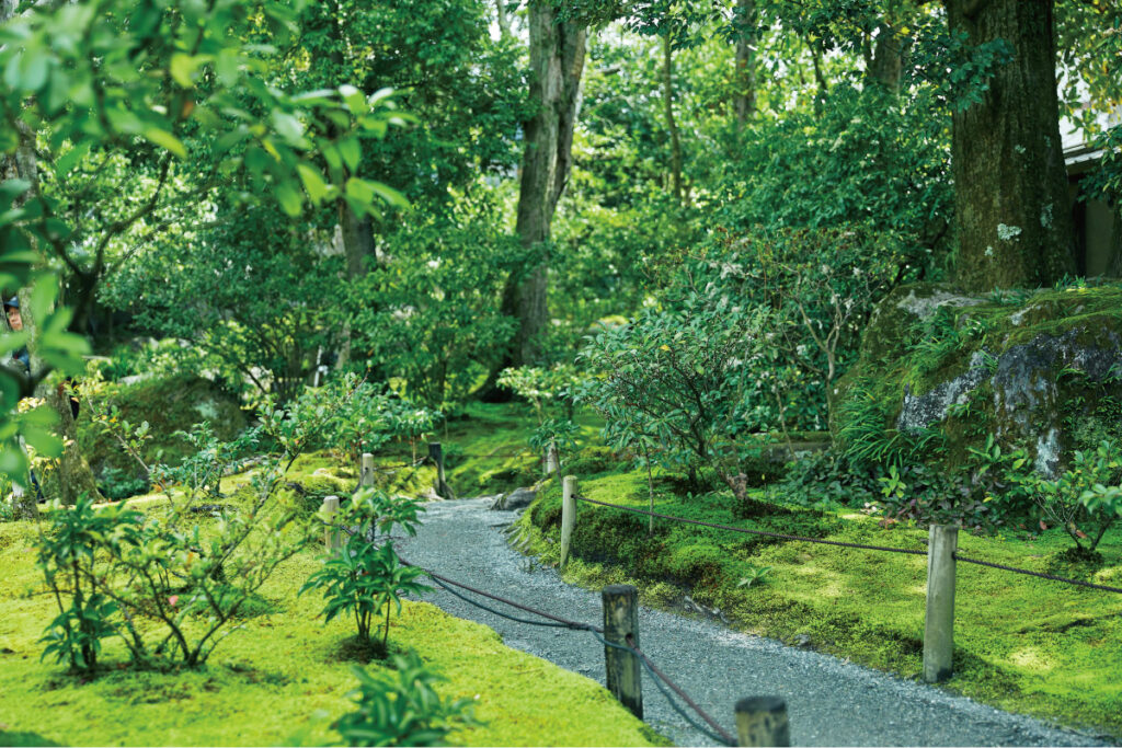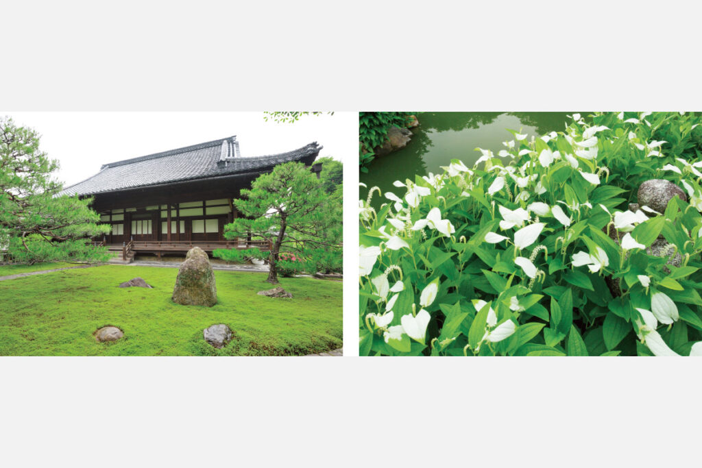 桃山時代に作庭された枯山水庭園の方丈前庭を抜けると、京都府指定名勝にも指定された半夏生のある書院前庭が現れる。雨が降ると苔が輝き、“雨が似合う庭園”と呼ばれるのも納得の美しさ。池泉回遊式で、池の周りに群生する、葉を白く変化させた半夏生と苔の鮮やかな緑が交じり合う凛とした世界を存分に味わいたい。
