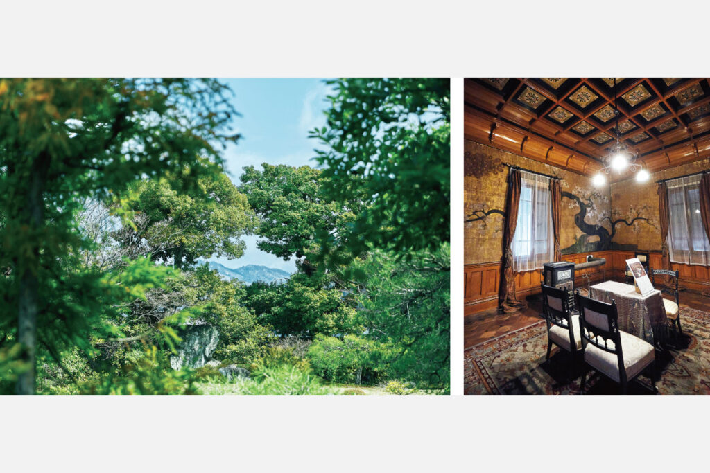 右/日露外交を決めた、無鄰菴会議が行われた洋館の一室。二重の格天井、壁に狩野派の特徴を持つ金碧障壁画という豪華な部屋は、一見の価値あり。