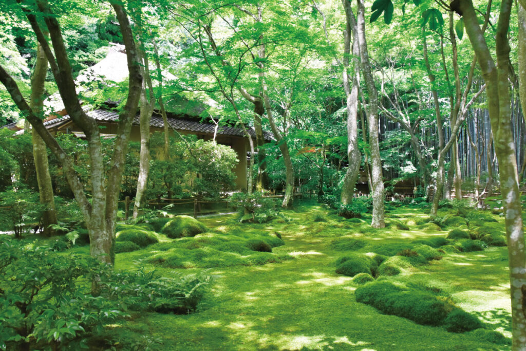 奥嵯峨に草庵を構える祇王寺は、白拍子・祇王が母や妹と共に出家した悲恋の尼寺。湿度の高いこの地域は、苔にとって絶好のロケーションで、しっとりやわらかな苔の絨毯と青モミジの競演が見物。梅雨から夏にかけて、輝く緑の絶景を楽しむことができる。ビロードのような美しい苔が維持されているのは、毎日2回の水やりと、こまめに落ち葉を掃除する職員の方のおかげ。苔庭の苔は約30種以上あり、境内に生える一部の植物を説明する棚も用意されているので、あわせてチェックして。