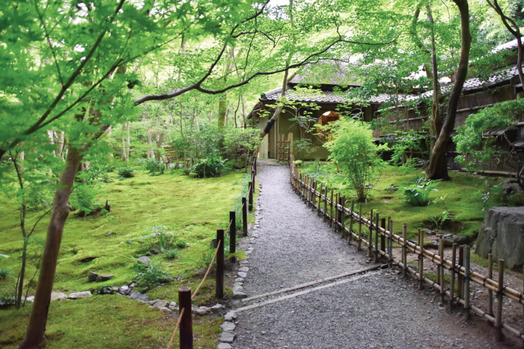 参道奥にある草庵の丸窓・吉野窓に差し込む光とその影、そして緑の葉が鮮やかな色彩を映し出す。「虹の窓」と呼ばれる神秘的な美しさも堪能したい。