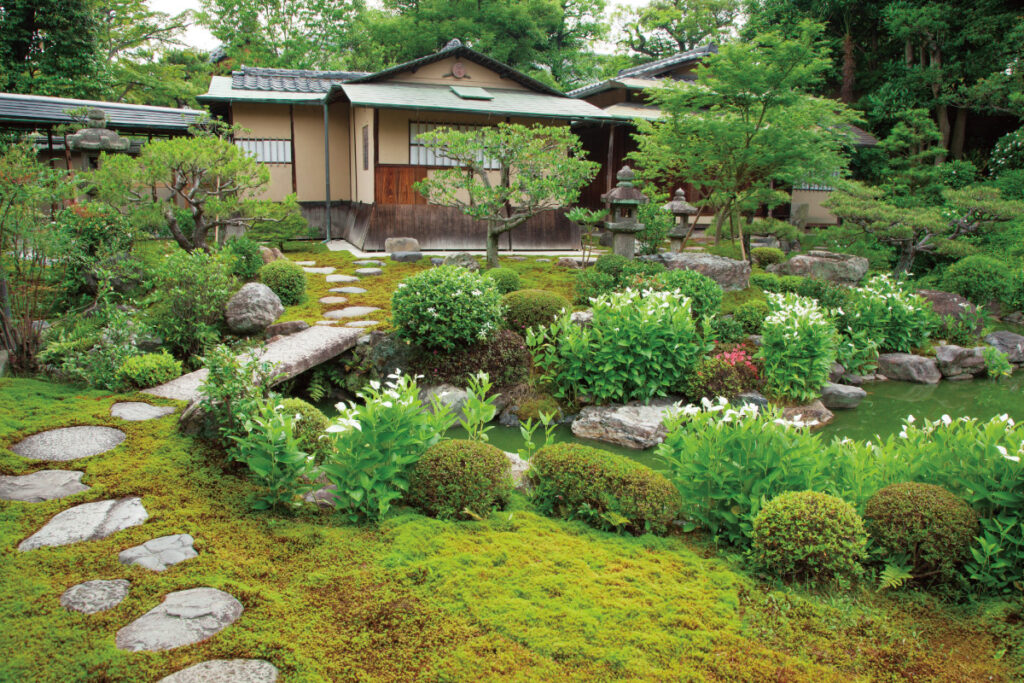 琵琶湖疏水の流れを生かした無鄰菴では、50種以上の苔を見ることができる。6月にはクチナシなど、季節によって咲く派手さはないが様々な美しい花との共演も見どころの一つ。