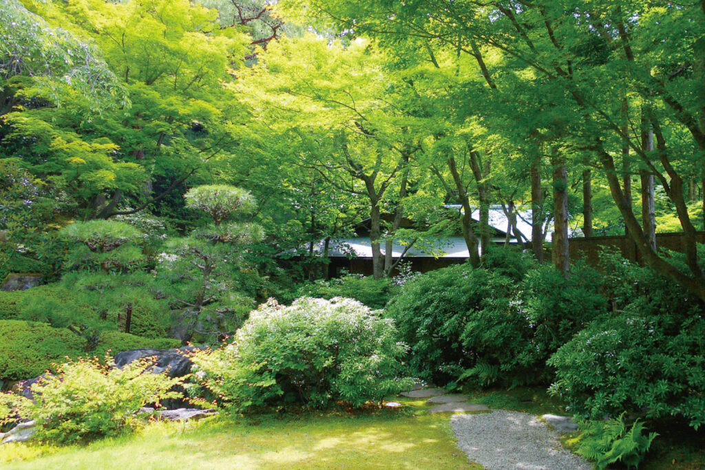 左/園内の管理は「山縣の造営の意図」を今でも大切にしており、高木を剪定し葉の間から比叡山が見えるようにしているのもその一つ。