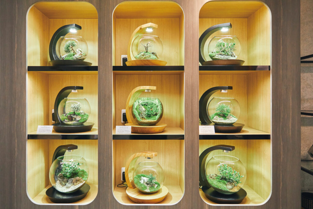 家に庭などがない人でも気軽に始めやすく育てやすいと人気。育てる上での相談はもちろん、植え替えなどのメンテナンスができるのもうれしい。作品は30,000円~(ライトスタンド込)。