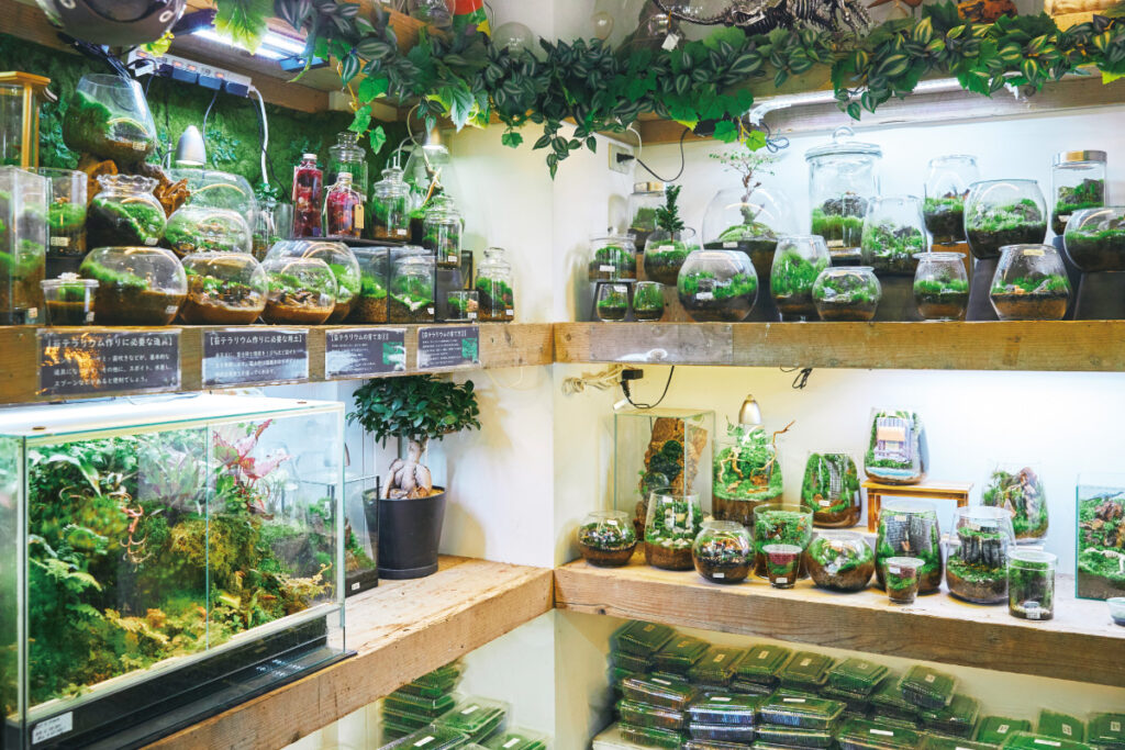 早くから苔に注目したショップを展開するのは、老舗園芸店の陽春園。熱帯植物など珍しい植物もそろう中、苔が多くを占める同店では、店長の濱嵜さんが手掛けた苔テラリウムのほか、タマゴケ、ヒノキゴケなど苔単体の購入も可能。また苔テラリウムの製作体験も開催し、自分だけの箱庭のような世界を作り上げることができる。併設のカフェで、自慢の苔パフェを味わいながら苔を思う存分堪能したい。