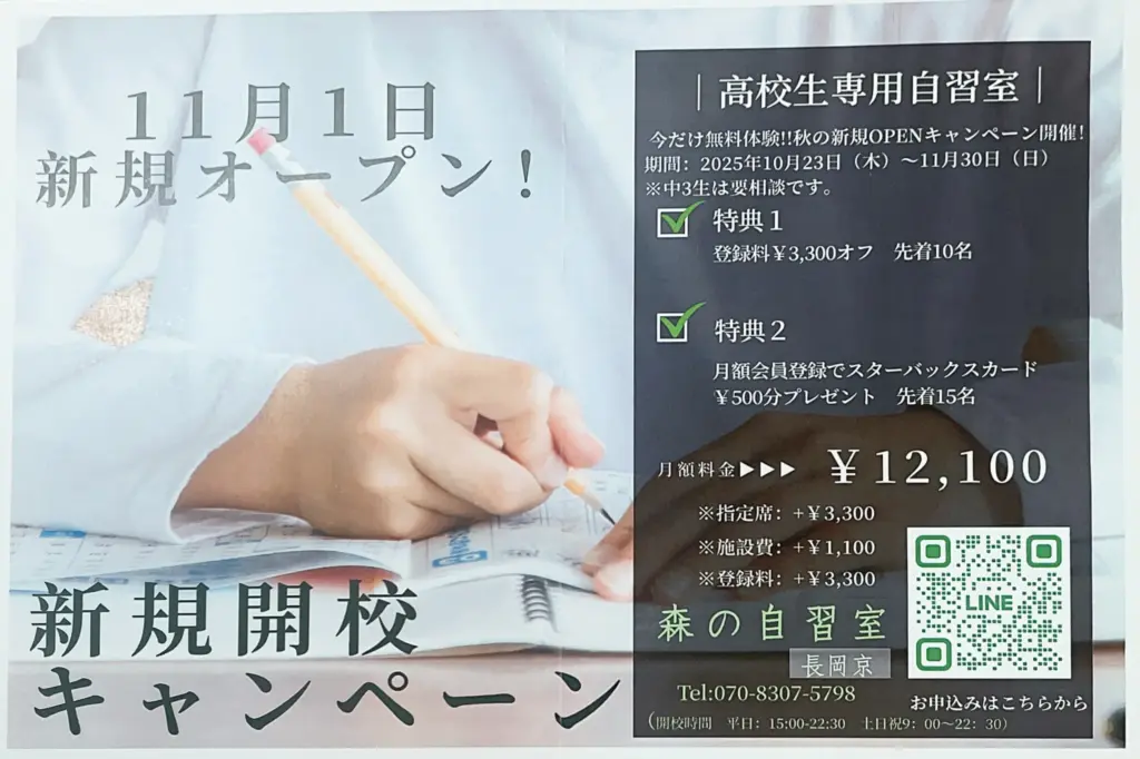 セブン通りに、高校生専用の自習室「森の自習室 長岡京」が11月1日、新たにオープンしました。