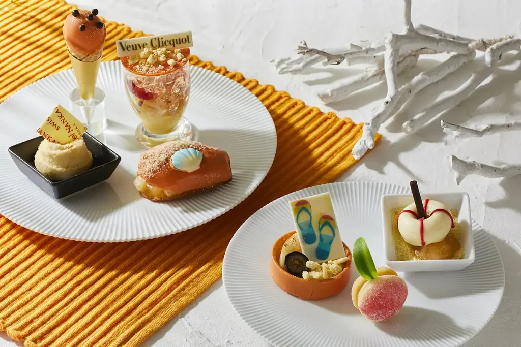 スイーツには、砂の城をモチーフにした「アールグレイと白桃のムース」、レモンの酸味と白桃の甘みが絶妙にマッチした「レモンクリームと白桃のマドレーヌサンド」などに加え、白桃とシャンパンの風味が広がる「白桃とヴーヴ・クリコのコンポートジュレ」など、7種類が用意されています。