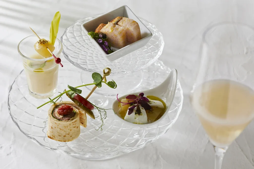 セイヴォリーではみずみずしい桃とモッツァレラチーズのカプレーゼをはじめ、ローストビーフとカクテルマヨネーズを薄く焼き上げた“ラバシュ”と呼ばれるパンで包んだ「ローストビーフ、ラバシュロールサンド」など、個性豊かな4品が彩りを添えます。