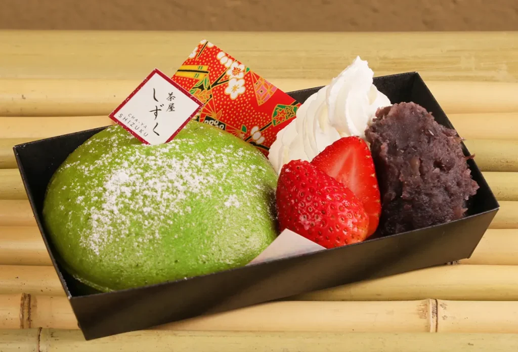 看板商品である「抹茶ふかしパウン」は、せいろから蒸したて、できたてで提供されます。抹茶の香りが引き立つよう甘さは控えめで、もっちりしつつもふわっとした軽い食感が、ついもうひと口食べたくなる味わいです。