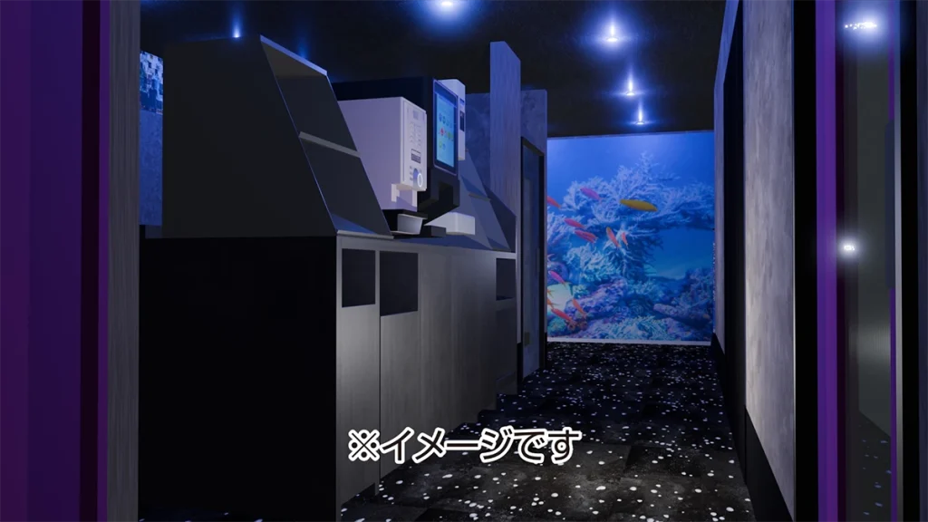 店内やカラオケルームは、海中をモチーフとした隠れ家のような落ち着いた内装デザインになっています。アクアリウムなどを模した映像演出で非日常的な空間が演出され、特別な雰囲気の中でカラオケを楽しむことができます。