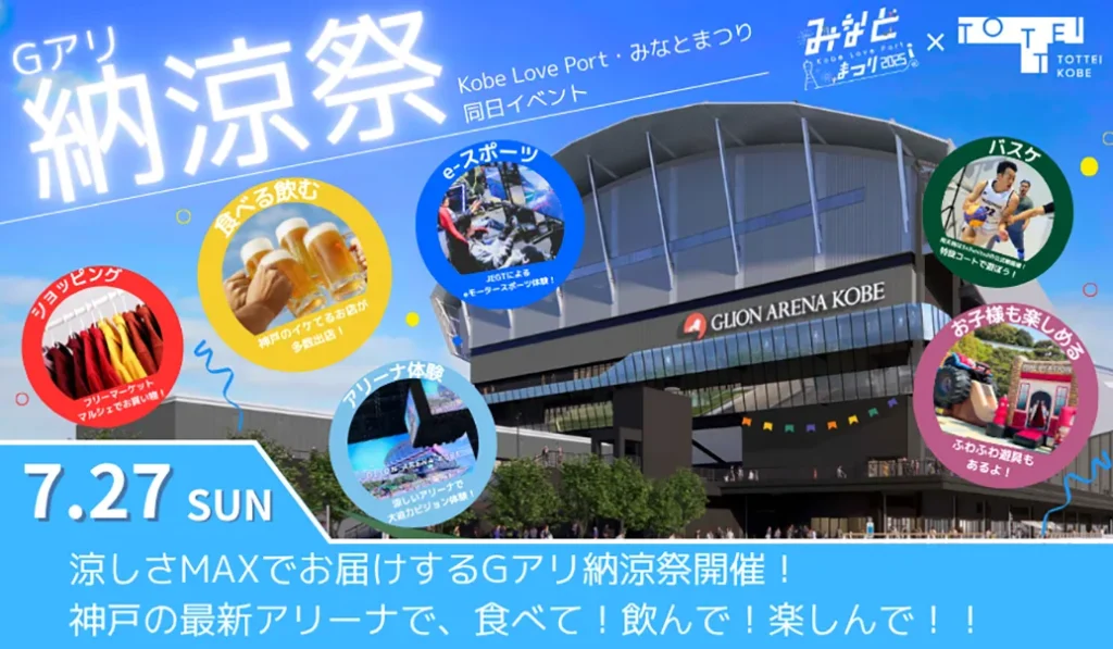 アリーナ周辺のTOTTEI / TOTTEI PARKでは、心地よい海風と80s MUSICで楽しむBEER YOGA(ビールヨガ)エクササイズ、神戸市消防・警察・海上保安庁と連携した海の日イベント、六甲山の雪遊びイベントなどが予定されています。一部詳細をお伝えします。
