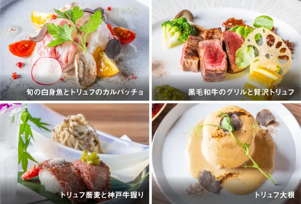 コースは5種類から選べ、トリュフや神戸牛、旬の魚介などを用いた贅沢で本格的なコースとなっています。前菜からメイン、デザートまで、1皿ごとに趣向を凝らした品で家族の特別な時間を彩ります。