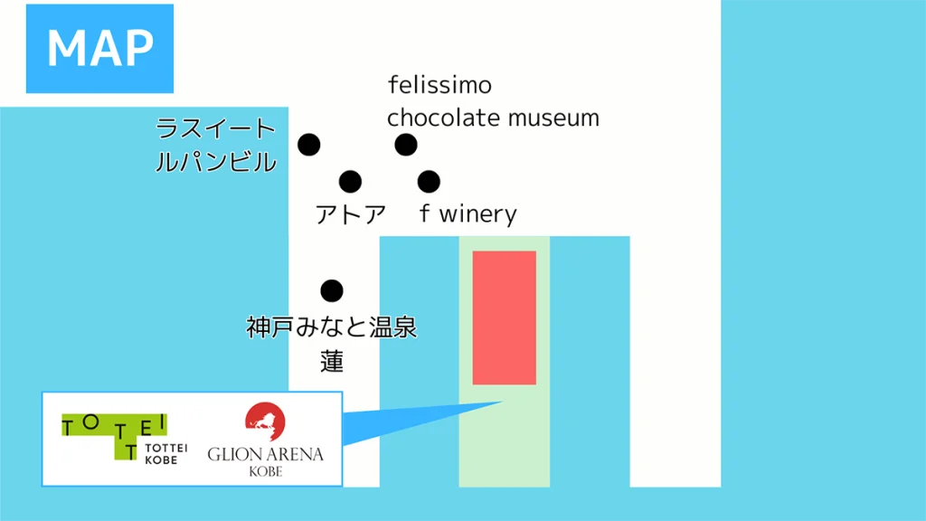 イベントが行われる一帯は、日本初・270度海に囲まれたアリーナ「GLION ARENA KOBE(ジーライオンアリーナ神戸)」を中心としたエンターテインメントエリア「TOTTEI」が中心。