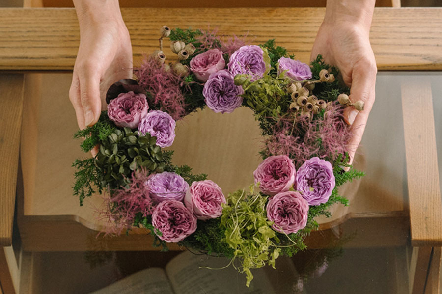 丸く弧を描くフラワーリースには、その始まりと終わりがないカタチから「永遠」と称されたり、一周回って「戻ってくる」と意味づけられ縁起もよいそう。