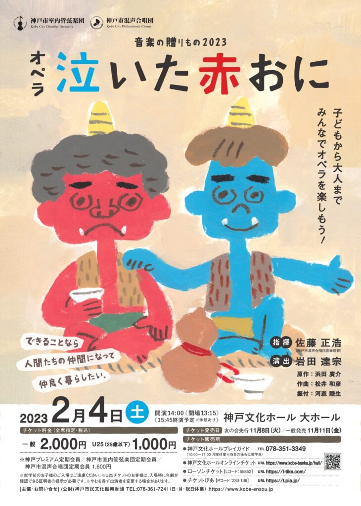 神戸市室内管弦楽団と神戸市混声合唱団が、神戸市内の小学4年生を対象にインリーチ事業(ホールに招いて開催する事業)として上演してきたオペラ「泣いた赤おに」。今年は2023年2月4日(土)に、だれでもオペラを鑑賞できる一般公演を開催する。