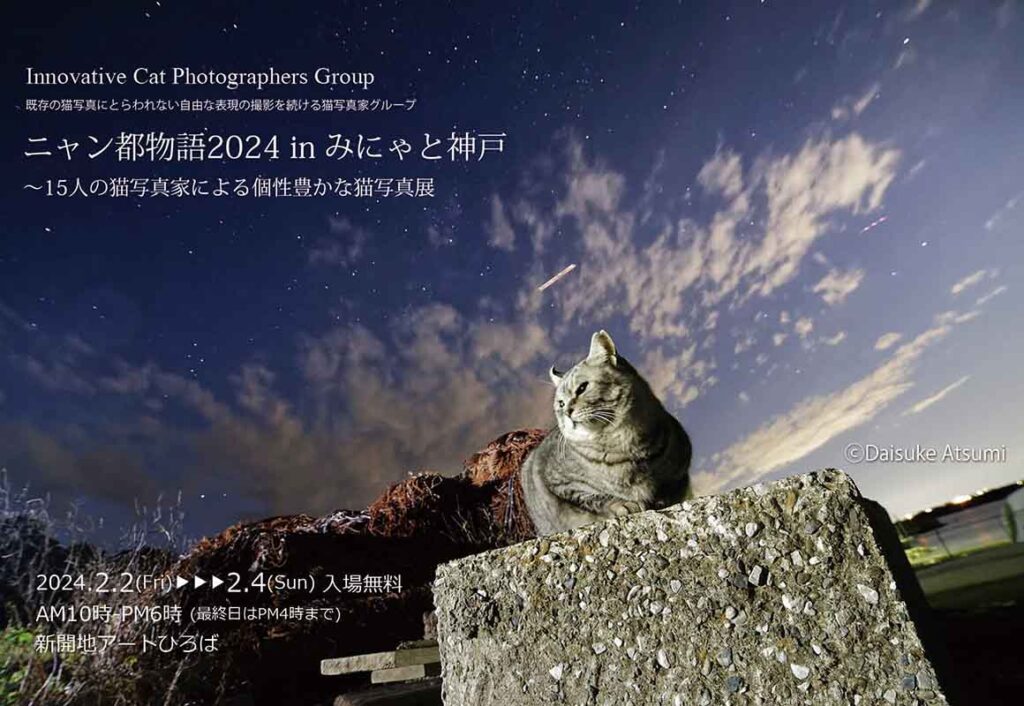 猫のしぐさ、表情、美しい風景の中の猫…。既存の猫写真にとらわれない自由な表現の撮影を続ける猫写真家グループInnovative Cat Photographers Group (ICPG)が、グループ写真展『ニャン都物語2024inみにゃと神戸』を新開地アートひろば(兵庫県神戸市)で2024年2月2日(金)~4日(日)に開催する。