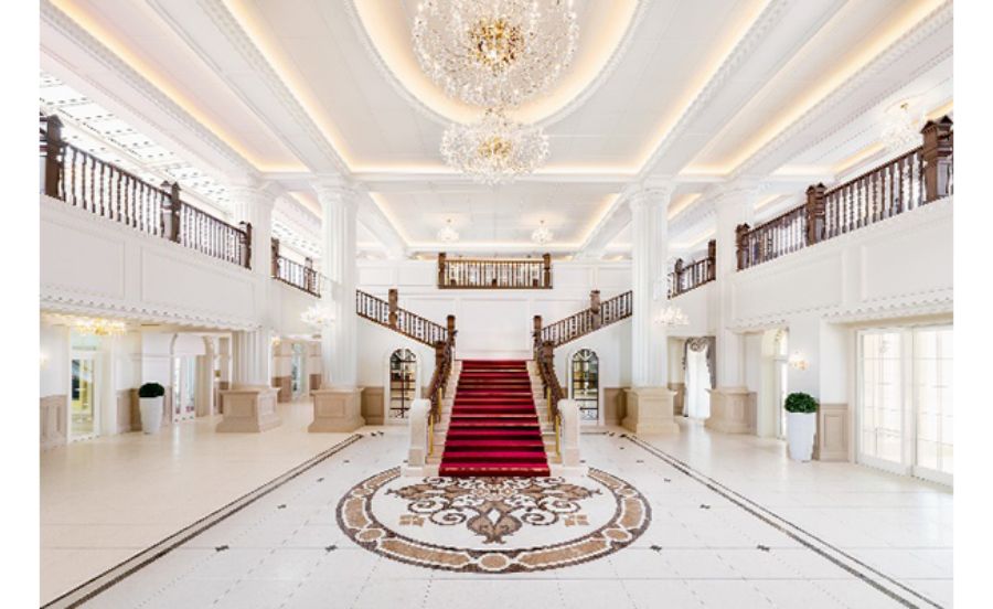 屋根やエントランスの外壁、半円形の屋根といった細やかな装飾は旧ホテルのデザインを復元し、上品で華やかな空間となっています。