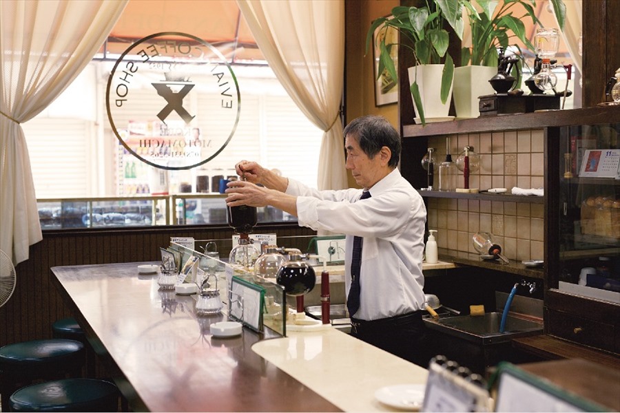 神戸元町商店街近くに昭和27(1952)年創業。中煎りの豆をやや多めにサイフォンへ。アルコールランプの炎でフラスコを温め、湯がロートに上がったらゆっくりとかき混ぜる。どっしりとした味わいが、自家製スイーツとも相性◎。