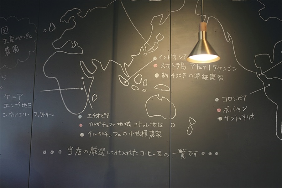 店内の黒板には、コーヒー豆の産地や農園情報が描かれている。