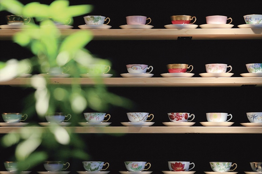 繊細でありながら豪華な絵付けが施されたカップ&ソーサー。カップのデザインも、味わいのひとつ。