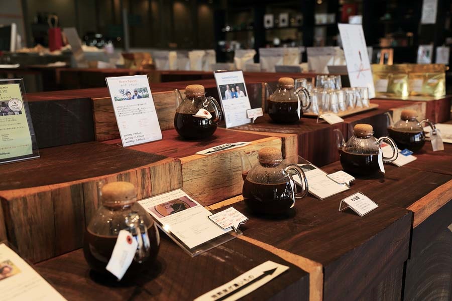 販売しているコーヒーを試飲できるコーナー。味や香りを比べてから購入できるのがうれしい。