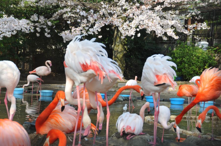 正面ゲートをくぐって左手にあらわれるのが、鮮やかなピンクの羽が美しいフラミンゴ。フラミンゴの頭上には、ちょうど桜が花開いていて、まさに春爛漫という言葉がぴったり!