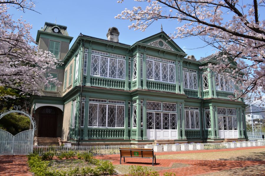 ベランダの窓枠のデザインが美しい緑の洋館と桜の取り合わせは、まるで絵画を観ているようで、うっとりしてしまいますね。