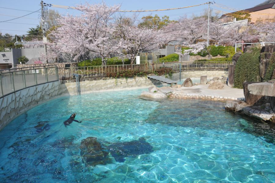 水色のプールをすいすいと気持ちよさそうに泳ぐアシカ。プールの柵に沿うように、ここにも桜が見事な花を咲かせています。