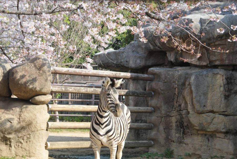 シタツンガの向かいには、桜を背景にして立つ凛々しいシマウマの姿が。王子動物園では、「凪斗(オス)」と「ラブ(メス)」の2頭が飼育されています。2人の間に誕生したシマウマの子どもたちは、今では全国の動物園に巣立ちました。