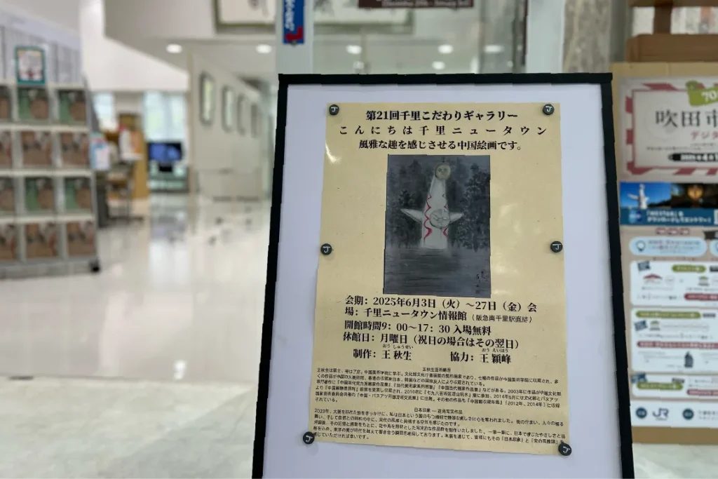 現在は、館のメイン部分である「千里こだわりギャラリー」にて、ミニ企画展『こんにちは千里ニュータウン 風雅な趣を感じさせる中国絵画です。』を開催中です。こちらは、2023年に大阪を旅した中国絵画の画家・王秋生さんによる個展。王さんの目を通して描かれる千里ニュータウンの街並みや、動植物など描いた作品を観覧できる企画展です。