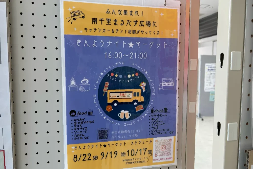 阪急南千里駅前の「南千里まるたす広場」を舞台に、毎月1回行われる「きんようナイト★マーケット」をご紹介します♪