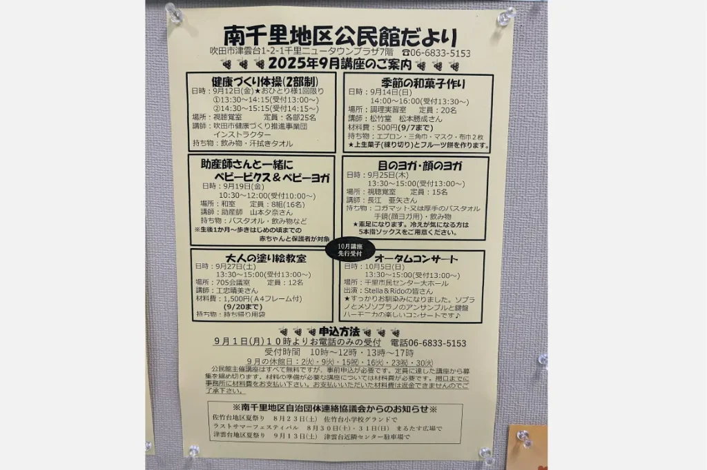 「千里ニュータウンプラザ」7階にある「南千里地区公民館」では、毎月魅力的な講座を開講しています。まもなく始まる9月のプログラムをピックアップしてご紹介します。