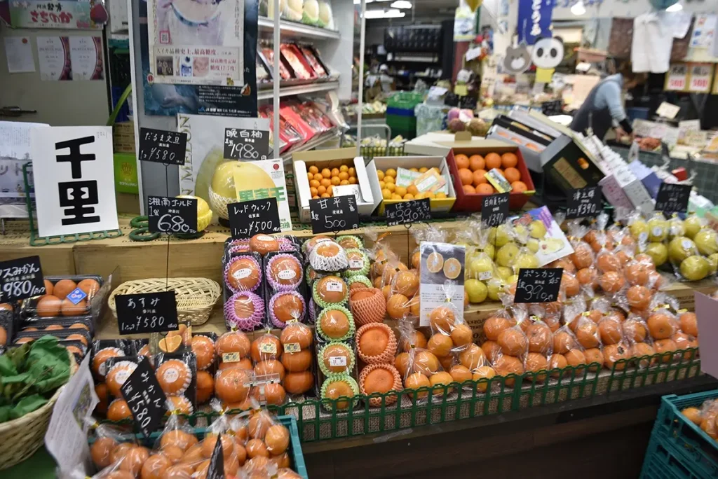引間さんが店主を務めるフルーツ千里には、日本各地から仕入れた美しいフルーツがずらりと並びます。