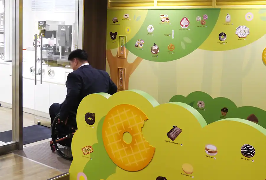 ドーナツの森前にあるスロープを利用すれば、車いす利用者の方や階段を利用することが難しい人にでも先にある「ミスドキッチン」へ入室しやすい施設を目指したのだそう。