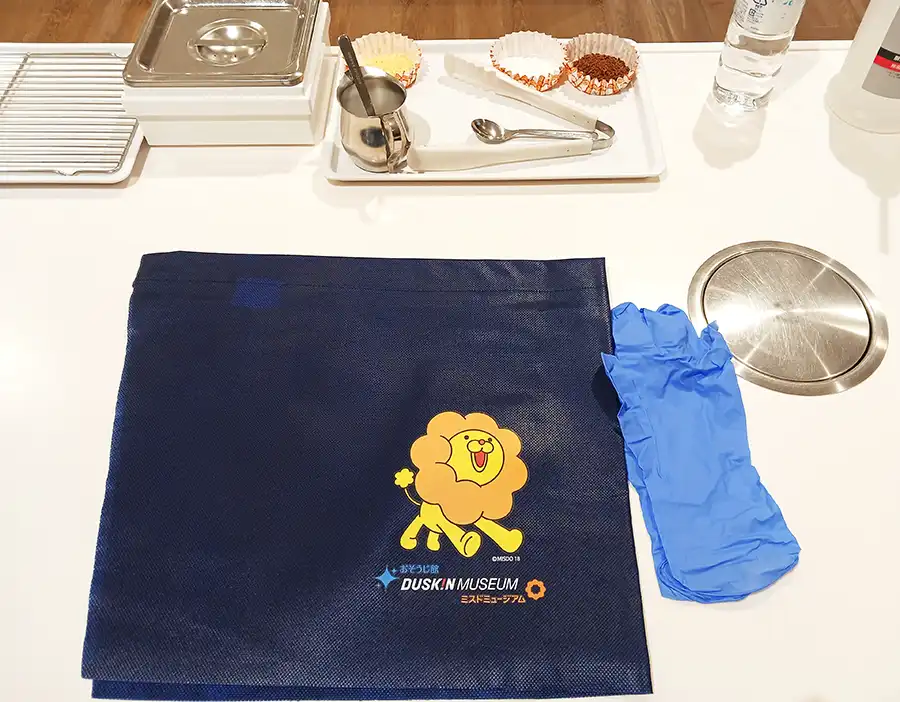 体験用に、ポン・デ・ライオンがプリントされたギャルソン型エプロンとゴム手袋がセット!着用して体験スタートです!