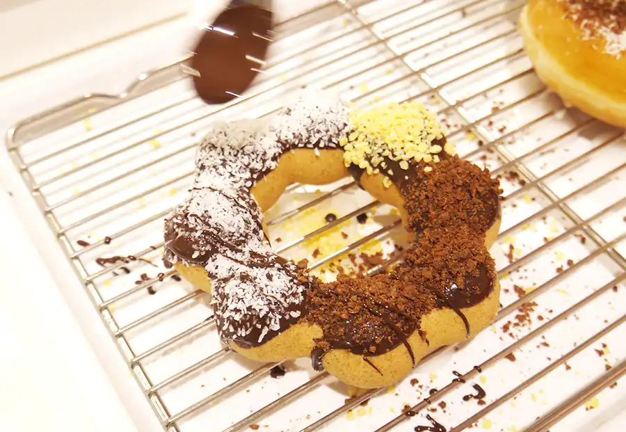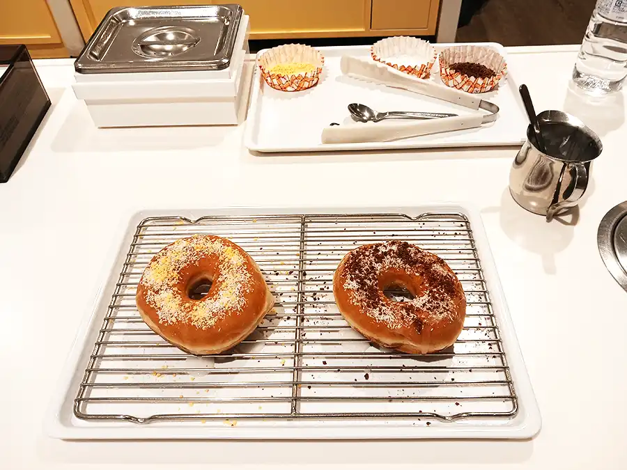 まず机には、揚げたてのドーナツにかけるグレーズとデコレーション用のゴールデントッピング、ココナツ、チョコクランチがラインアップ。