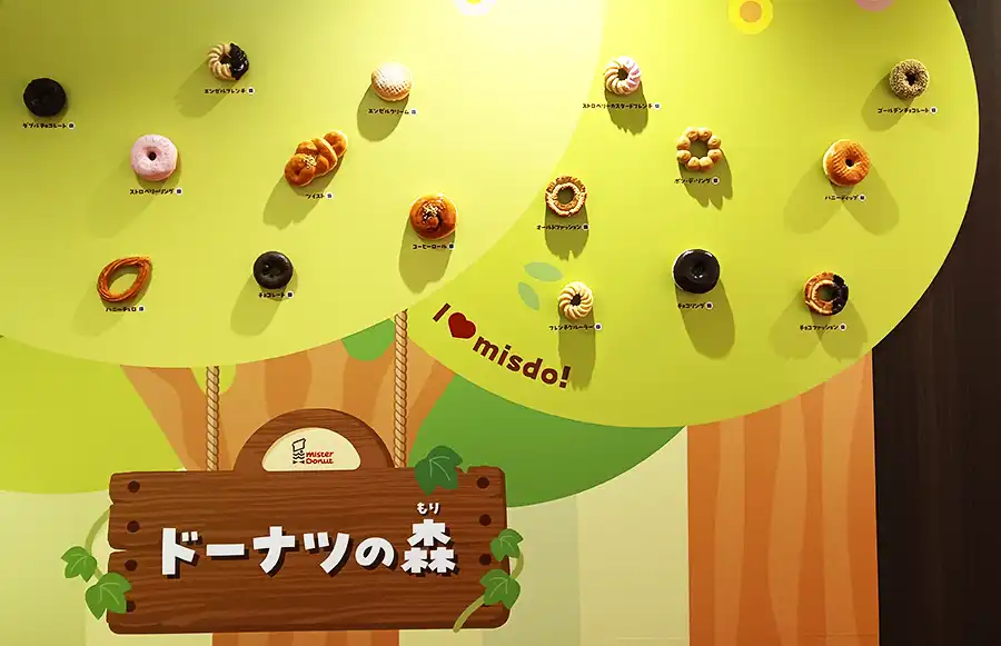 この「ドーナツの森」中央には、「ポン・デ・リングの木」と呼ばれるものが描かれています。やはり「ポン・デ・リング」はミスタードーナツの歴史を記すうえでは絶対に外せない、大事な商品なのだそう。ちなみにポン・デ・リング発売は2003年、すっかりお馴染みの商品なのでもっと長く販売されていそうな気もします。