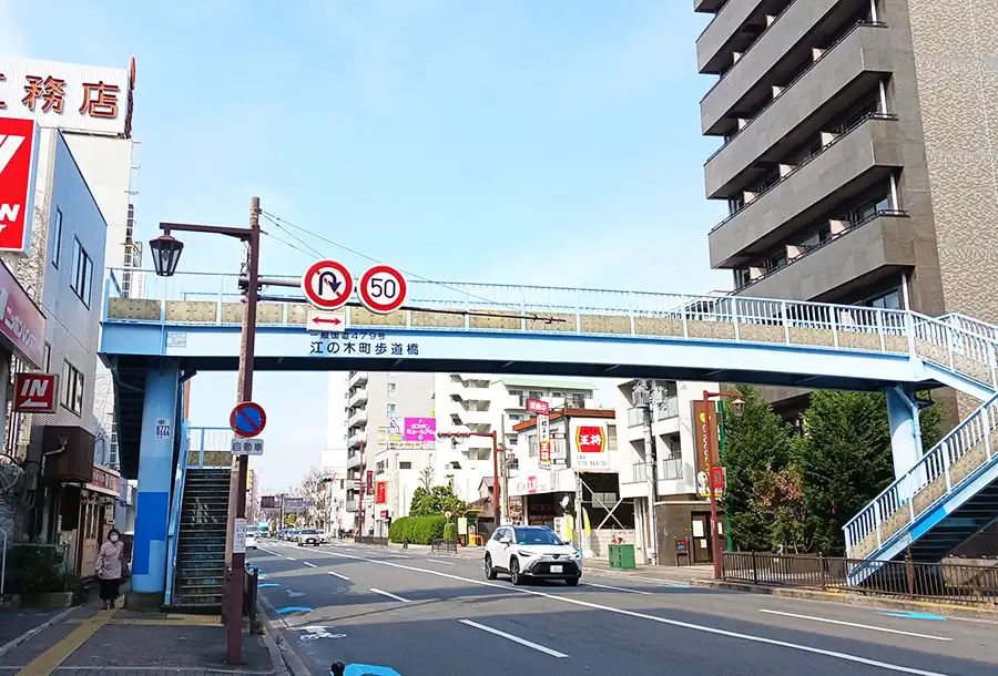 4 江の木町歩道橋が見えたら、横断歩道をわたっておきます。