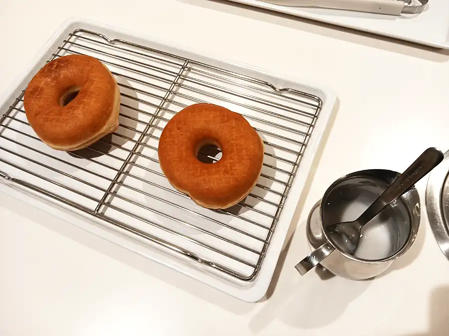 「ドーナツが熱いうちにグレーズをスプーン1〜2杯かけてくださいね」とスタッフの方。グレーズはお砂糖のシロップなので、ドーナツにかける前にポットの中でぐるぐるかき混ぜてやわらかくします。ドーナツの上から満遍なくかけて!